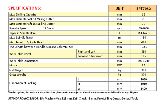 Model SPT7032 Milling & Drilling Machine is designed for cutting operation or milling and drilling. If being fitted with special accessories, it can perform boring and milling operation.